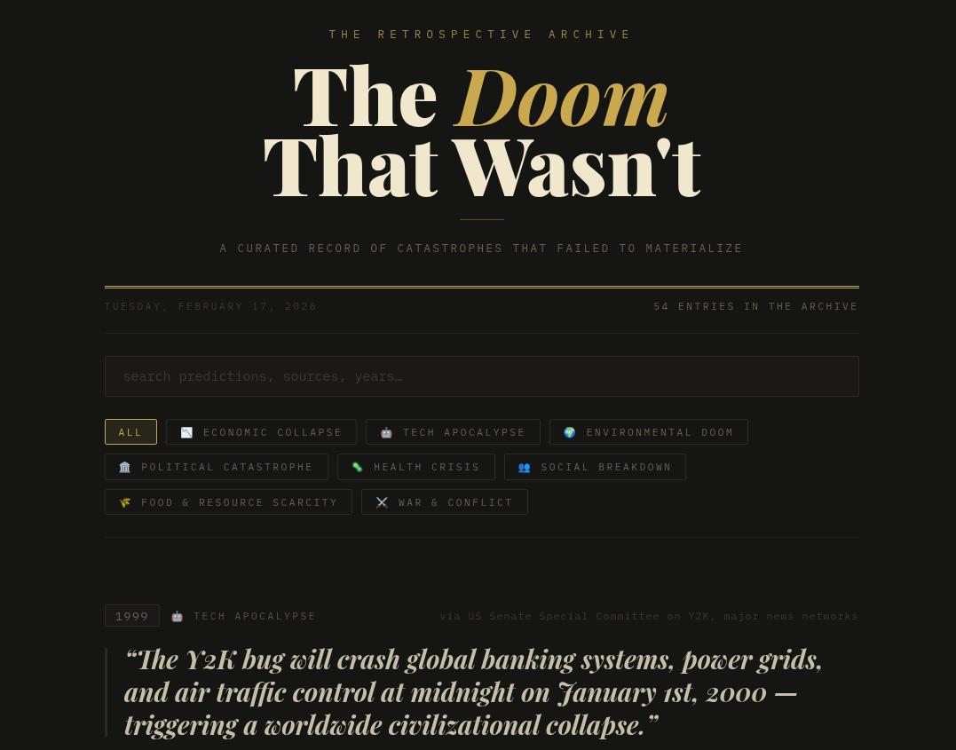 DoomScrollA curated record of catastrophes that failed to materializeInnomenFeb 17, 202632Sharehttps://innomen.github.io/DoomScroll/Thanks Lal9! (Source)
