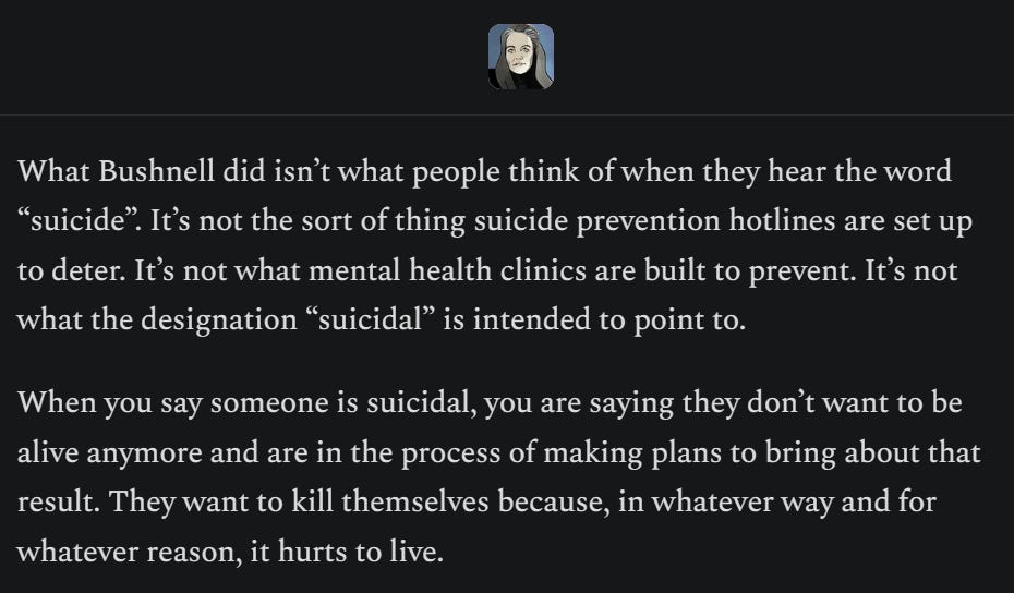 I think art captured this best. People have the right to die, and no one should suffer. Yes. But suicide is suicide. Even if you’re in favor of it, spinning it to provide cover is not the way imo.