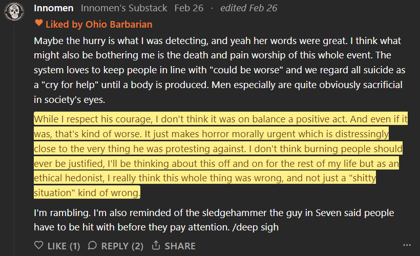 I said right away that I’d have rather he lived for the cause and made his enemies kill him. Expressly because I knew people would romanticize it. The brutal meathook reality of burning someone alive, is receding further and further away the more it becomes a folk song. That’s playing with fire, literally and figuratively.
