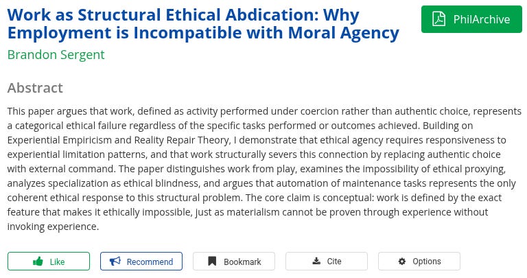 By its nature, work disconnects us from this ethical ground and forces us to prioritize external demands. The goal should be to eliminate this disconnection through automation and the reduction of forced labor.